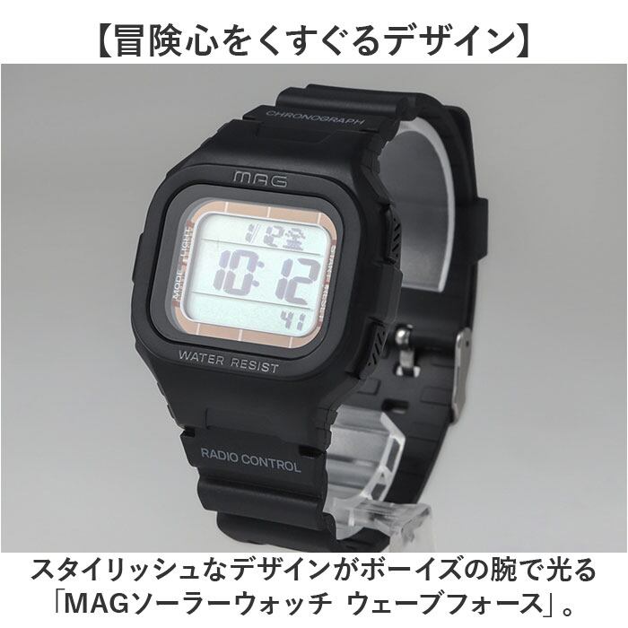 ・スタイリッシュなデザインがボーイズの腕で光る「MAGソーラーウォッチ ウェーブフォース」。