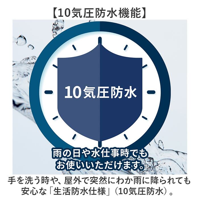 ・手を洗う時や、屋外で突然にわか雨に降られても安心な「生活防水仕様」(10気圧防水)。