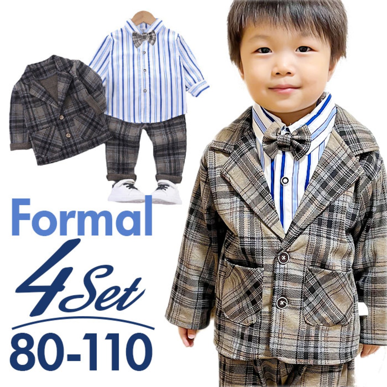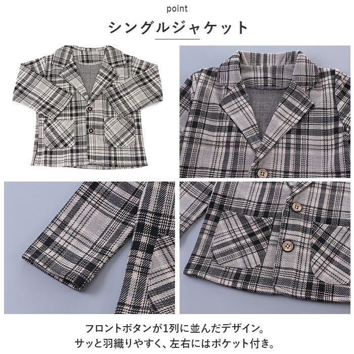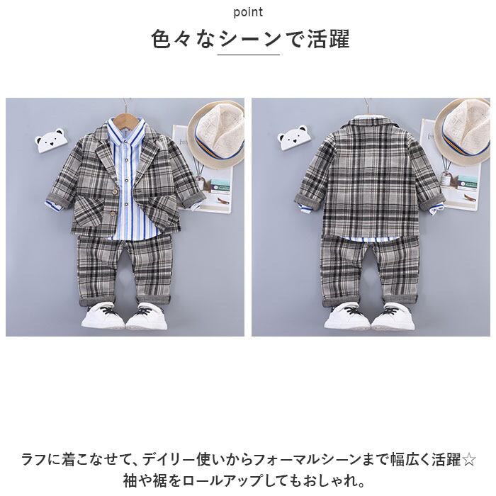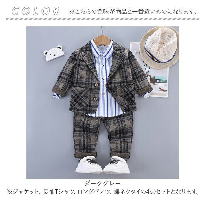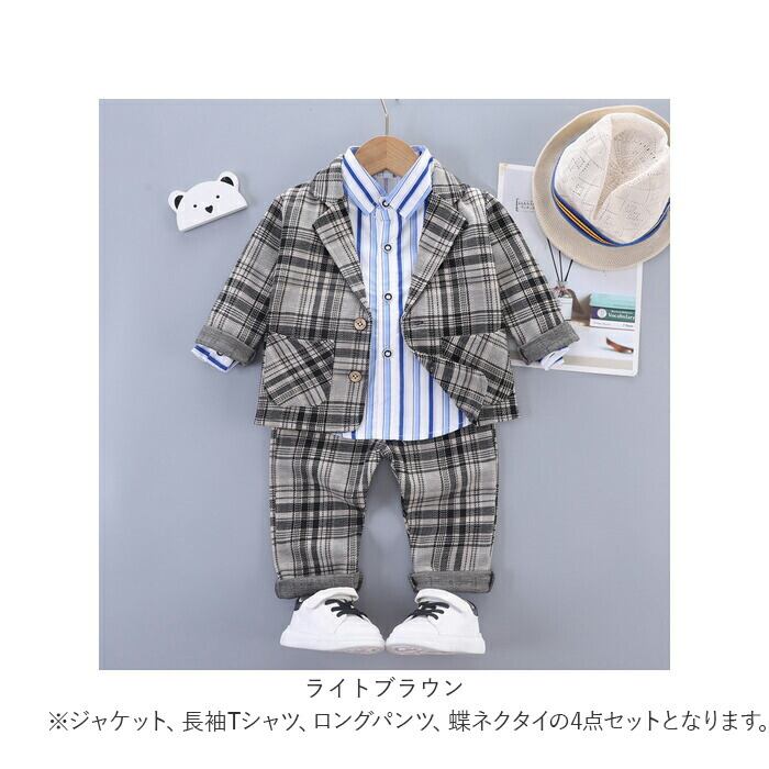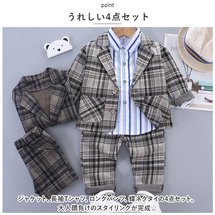 ・ジャケット、長袖Tシャツ、ロングパンツ、蝶ネクタイの4点セット。大人顔負けのスタイリングが完成☆