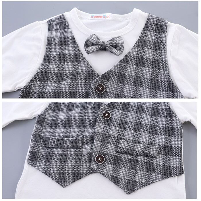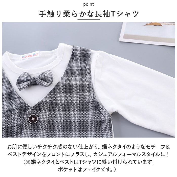 ・お肌に優しいチクチク感のない仕上がり。蝶ネクタイのようなモチーフ&ベストデザインをフロントにプラスし、カジュアルフォーマルスタイルに!(※蝶ネクタイとベストはTシャツに縫い付けられています。ポケットはフェイクです。)