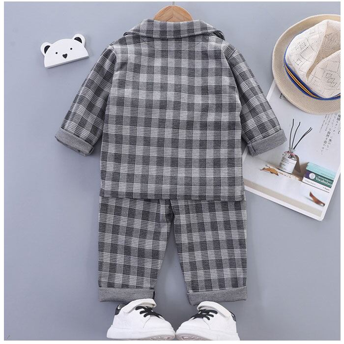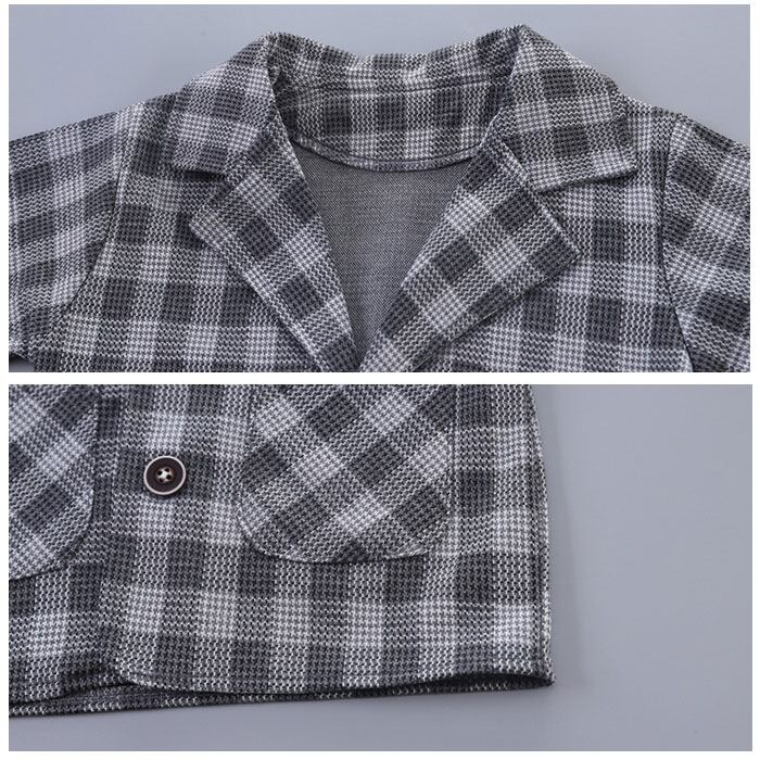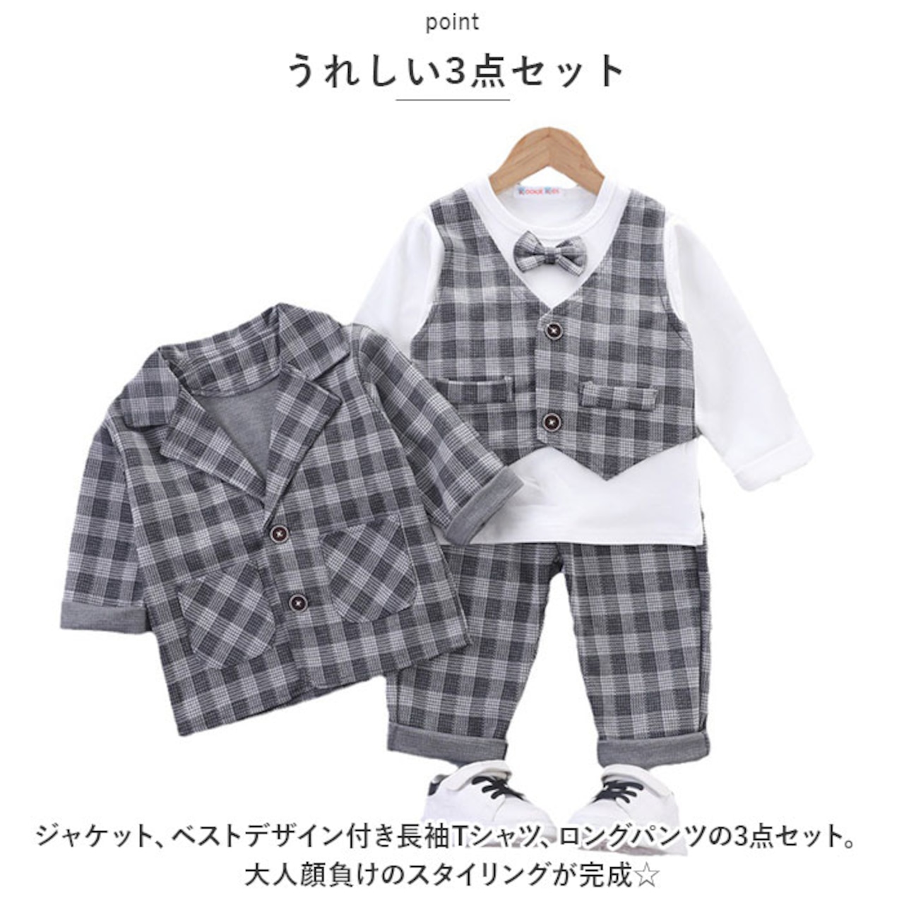 ・ジャケット、ベストデザイン付き長袖Tシャツ、ロングパンツの3点セット。大人顔負けのスタイリングが完成☆