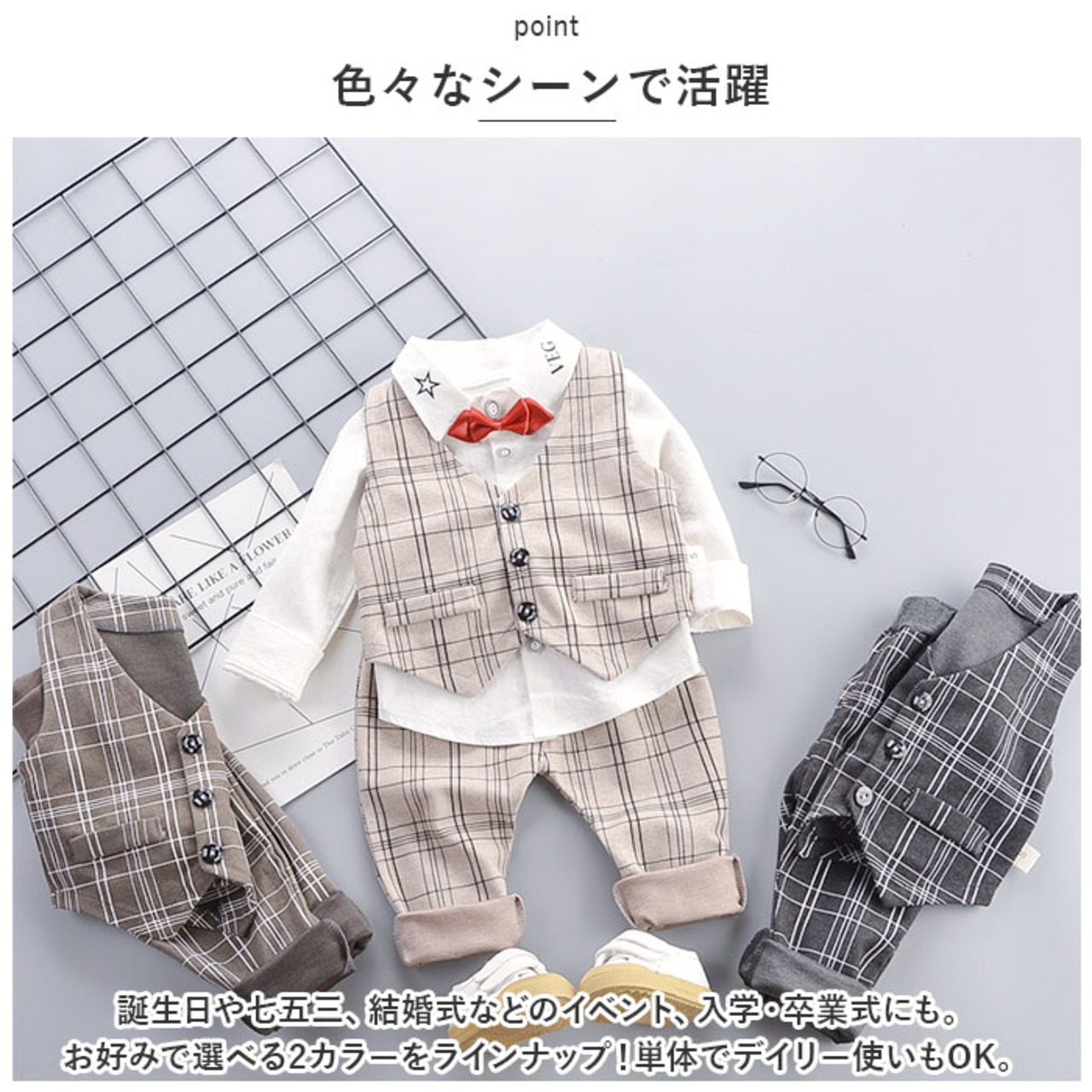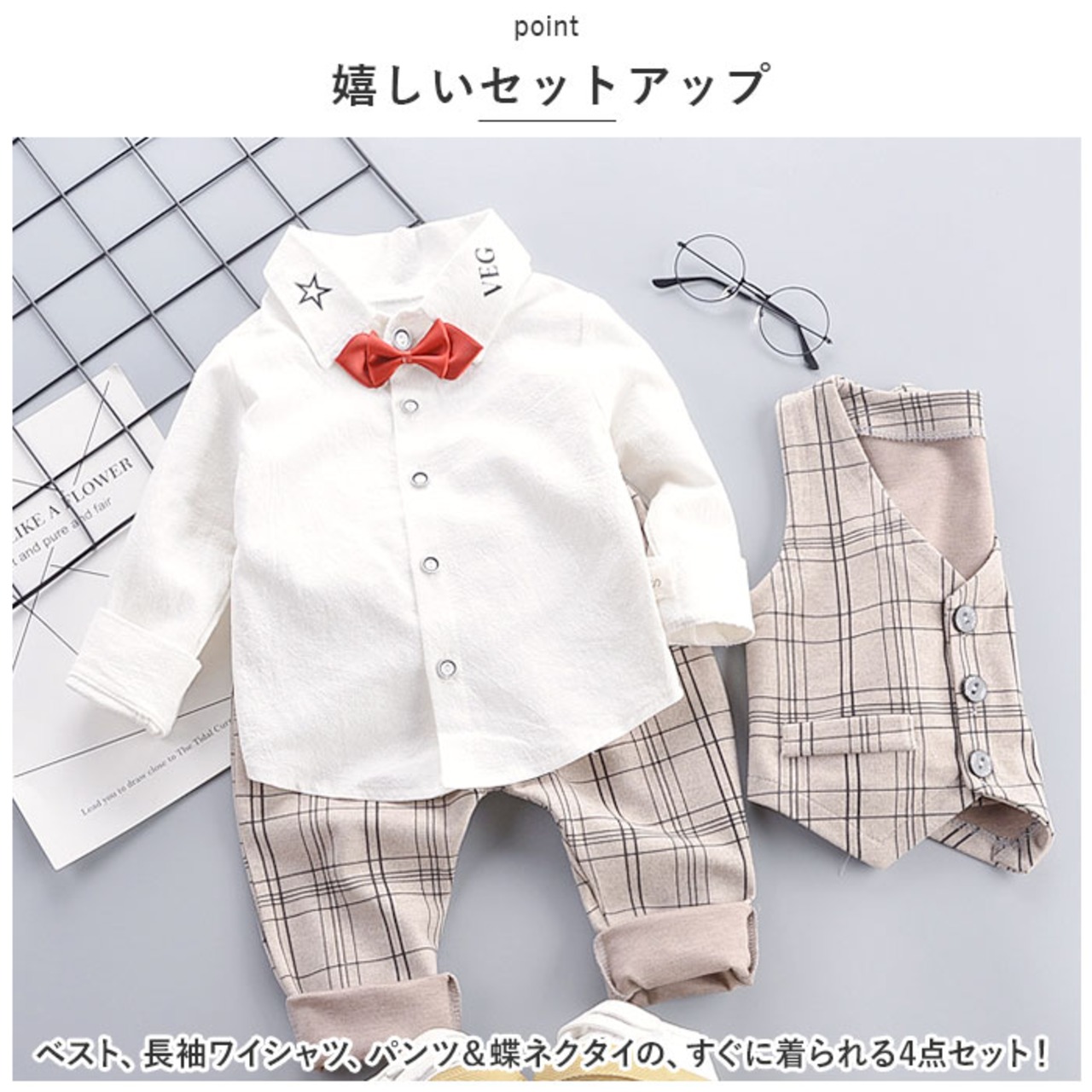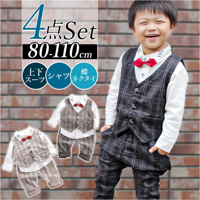 ・ベスト、長袖ワイシャツ、パンツ&蝶ネクタイの、すぐに着られる4点セット!