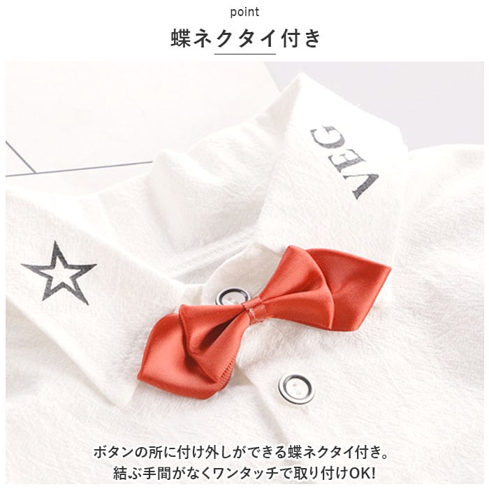・ボタンの所に付け外しができる蝶ネクタイ付き。結ぶ手間がなくワンタッチで取り付けOK!