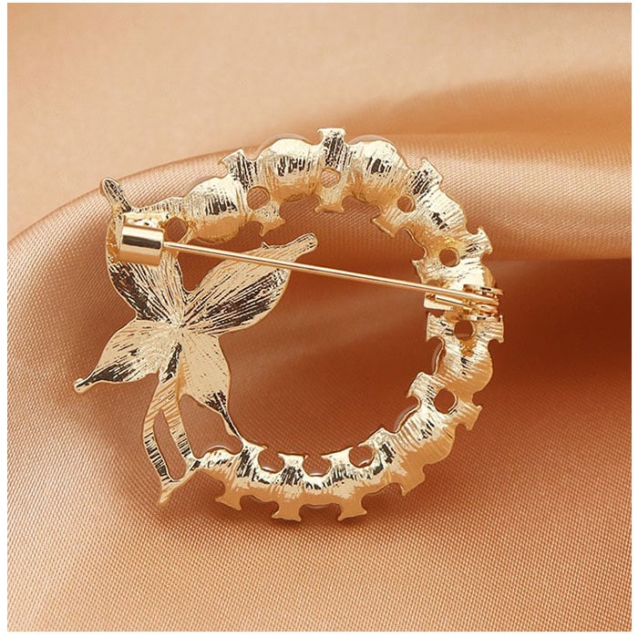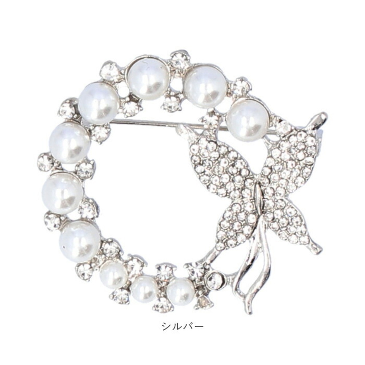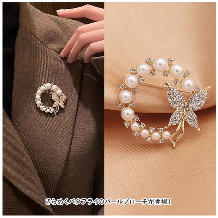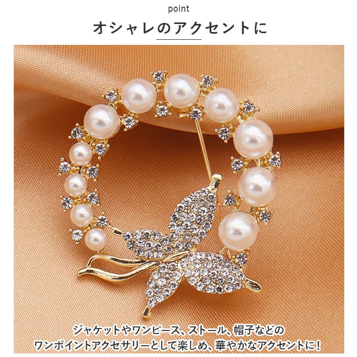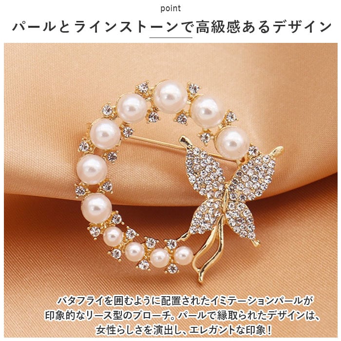 ・バタフライを囲むように配置されたイミテーションパールが印象的なリース型のブローチ。パールで縁取られたデザインは、女性らしさを演出し、エレガントな印象!