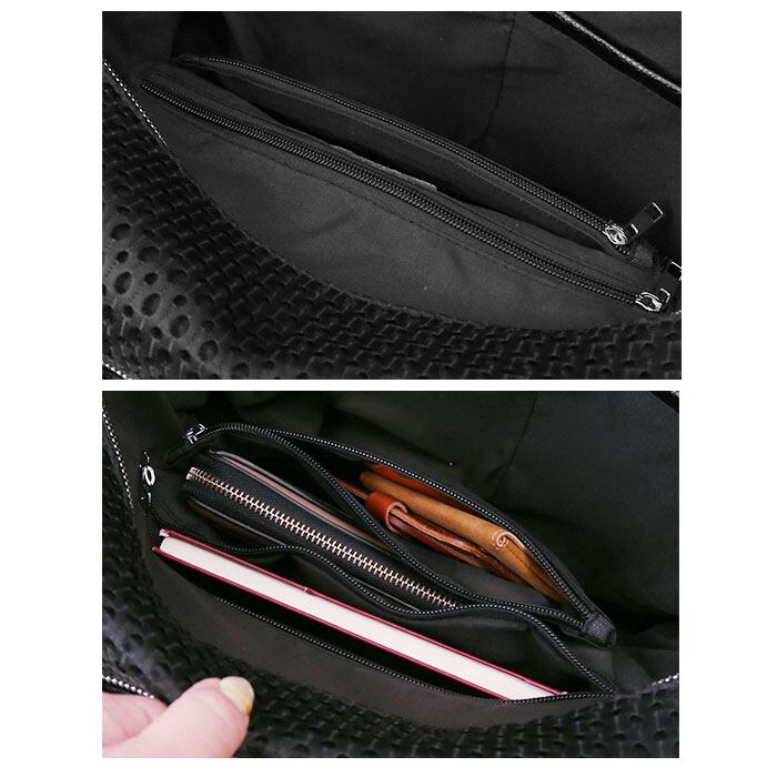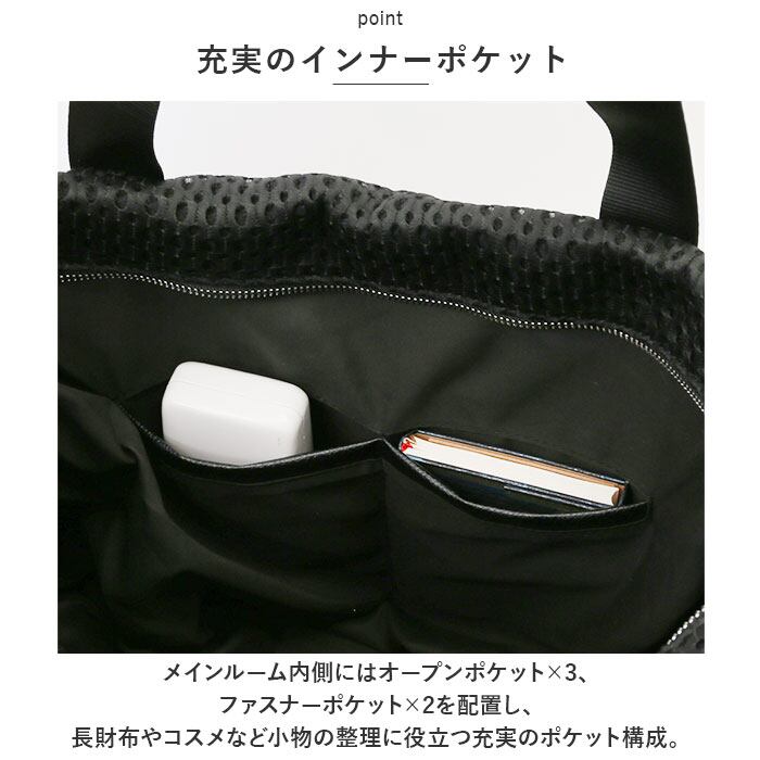 ・メインルーム内側にはオープンポケット×3、ファスナーポケット×2を配置し、長財布やコスメなど小物の整理に役立つ充実のポケット構成。