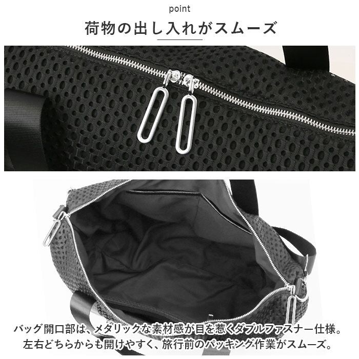 ・バッグ開口部は、メタリックな素材感が目を惹くダブルファスナー仕様。左右どちらからも開けやすく、旅行前のパッキング作業がスムーズ。