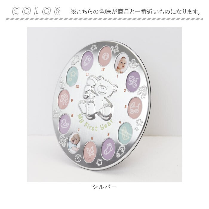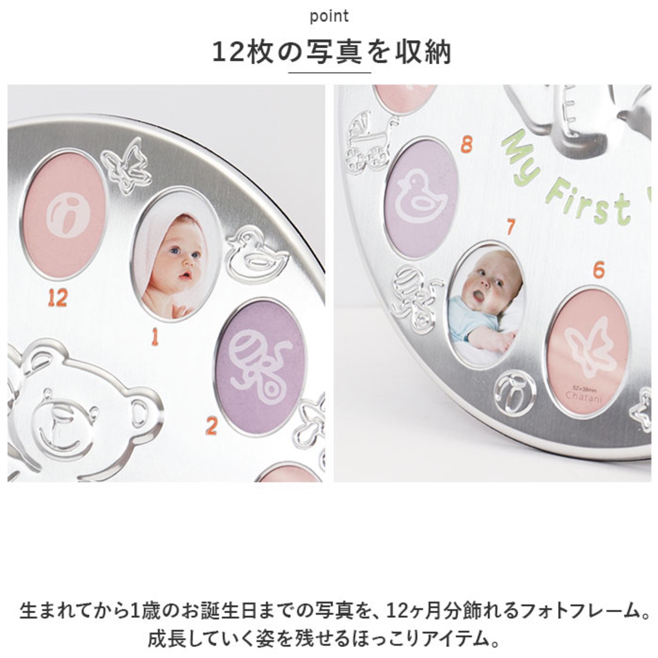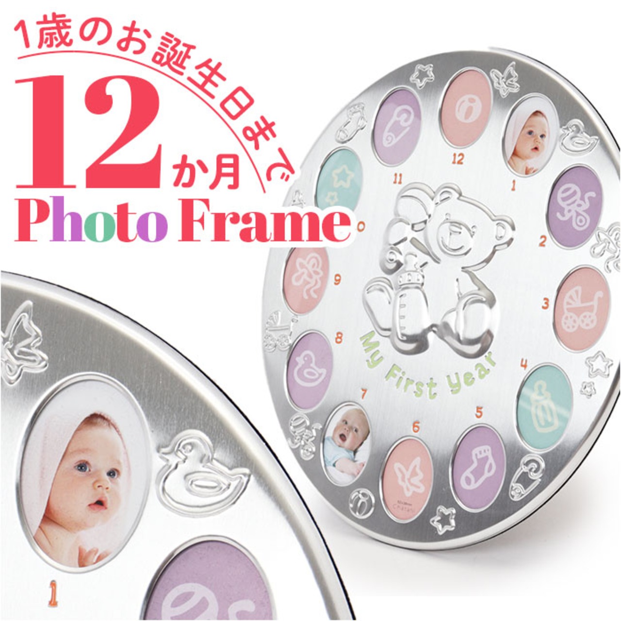 ・生まれてから1歳のお誕生日までの写真を、12ヶ月分飾れるフォトフレーム。成長していく姿を残せるほっこりアイテム。