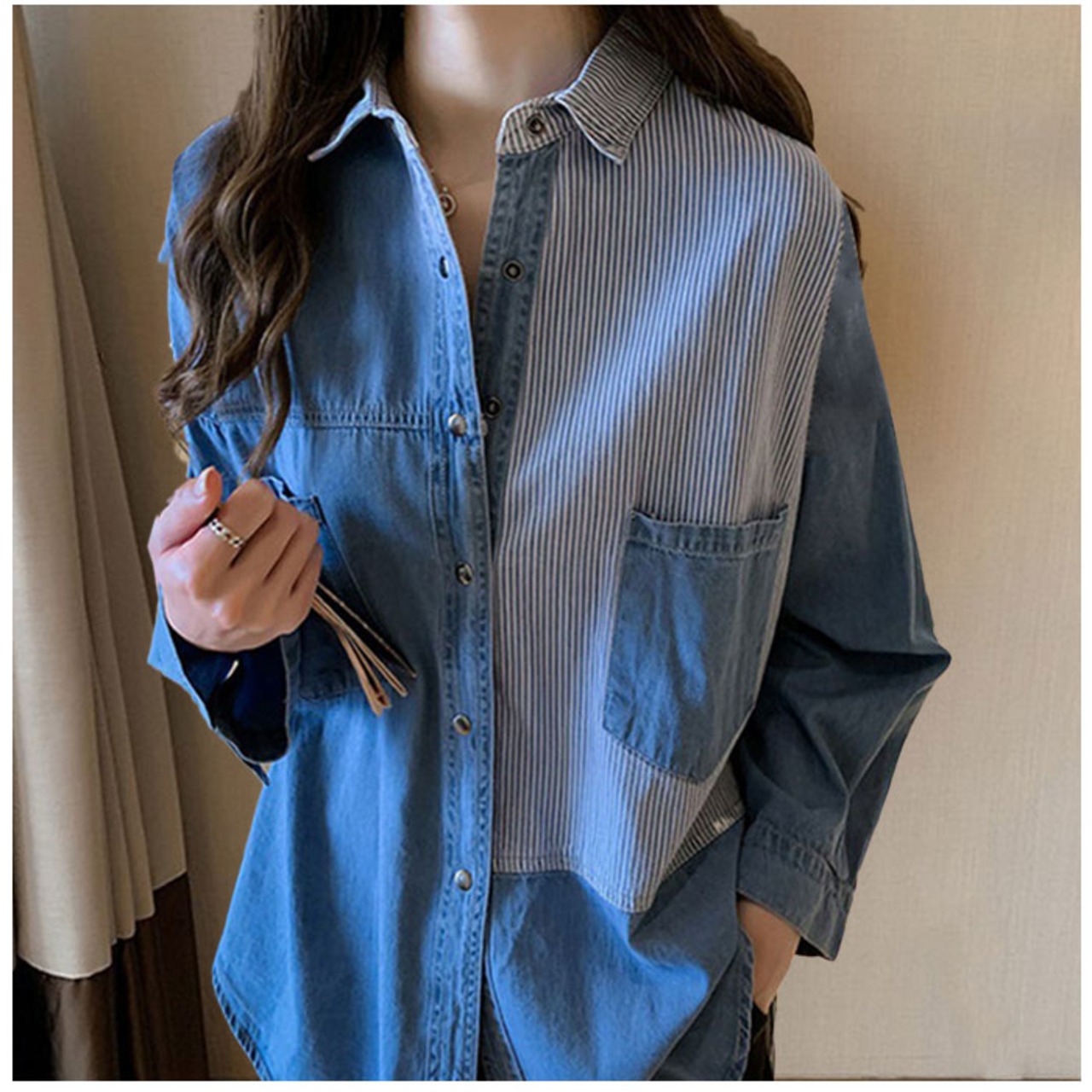・カジュアルさを抑えた大人らしい雰囲気が魅力のデニム風長袖シャツ。