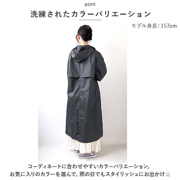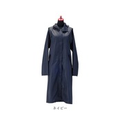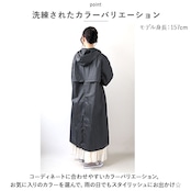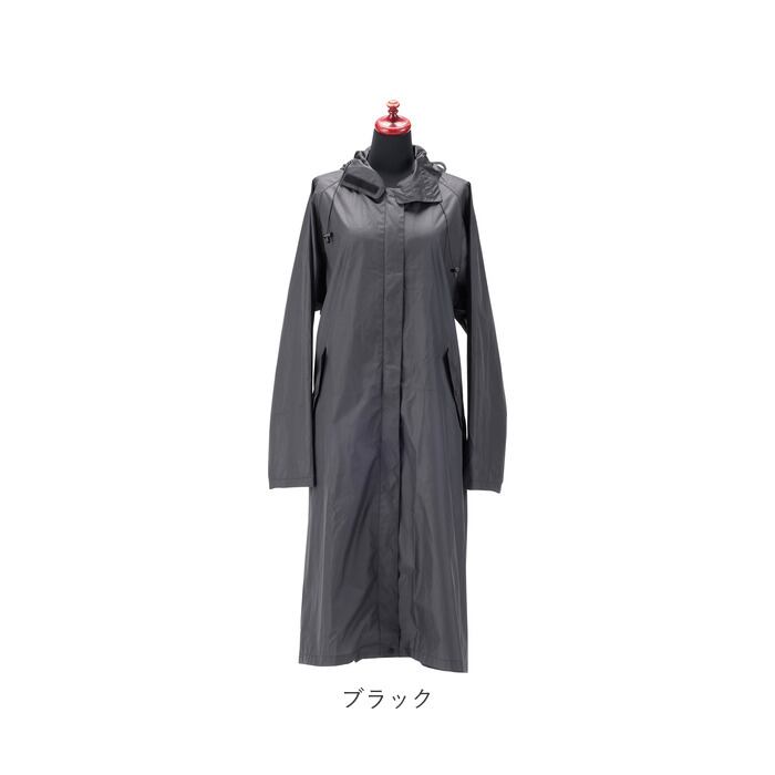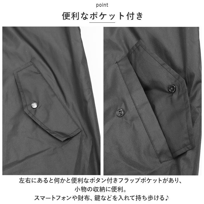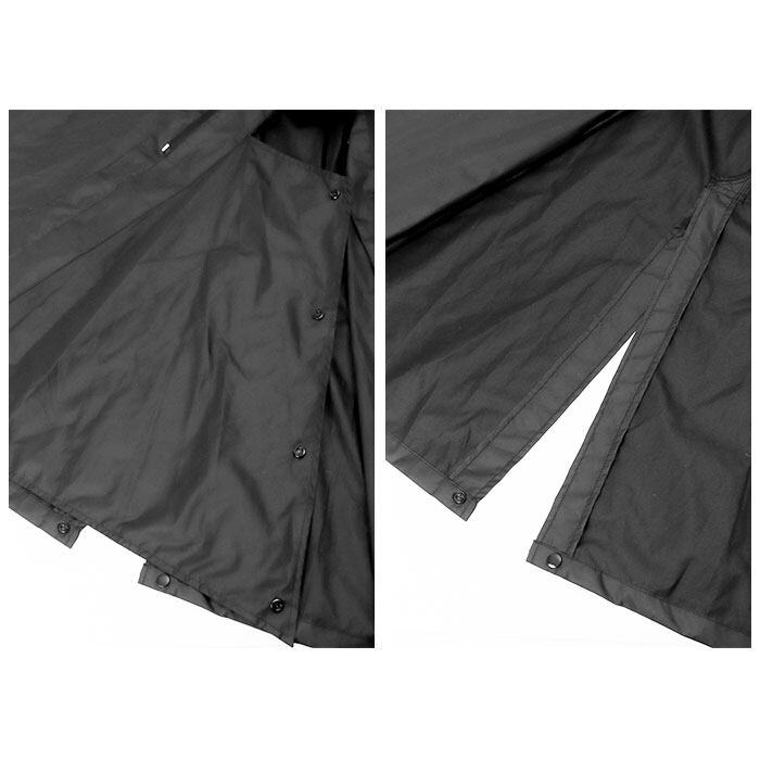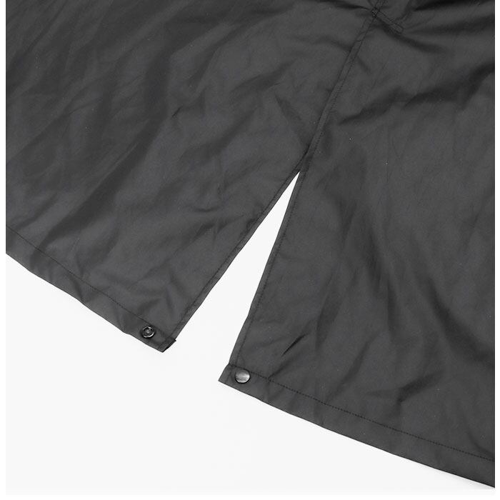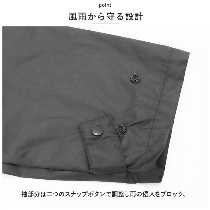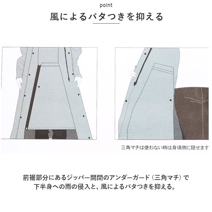 ・袖部分は二つのスナップボタンで調整し雨の侵入をブロック。前裾部分にあるジッパー開閉のアンダーガード(三角マチ)で下半身への雨の侵入と、風によるバタつきを抑える。フロントファスナーは雨の侵入を防ぐための二重のフラップを配置。スナップボタン留めで防水予防は万全。(※三角マチは使わないときは見頃側に隠せます。)