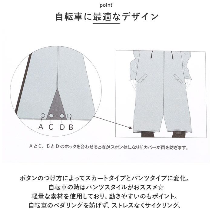 ・自転車に乗る際に最適なデザインが特徴。ボタンのつけ方によってスカートタイプとパンツタイプに変化。自転車の時はパンツスタイルがおススメ☆軽量な素材を使用しており、動きやすいのもポイント。自転車のペダリングを妨げず、ストレスなくサイクリング。