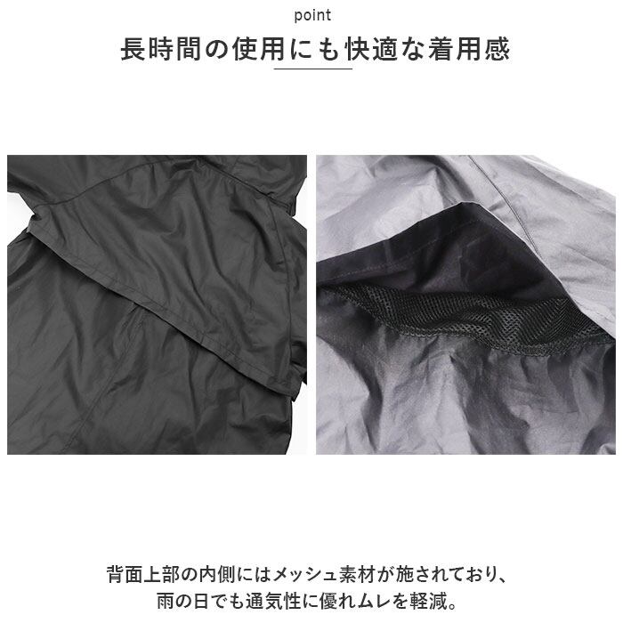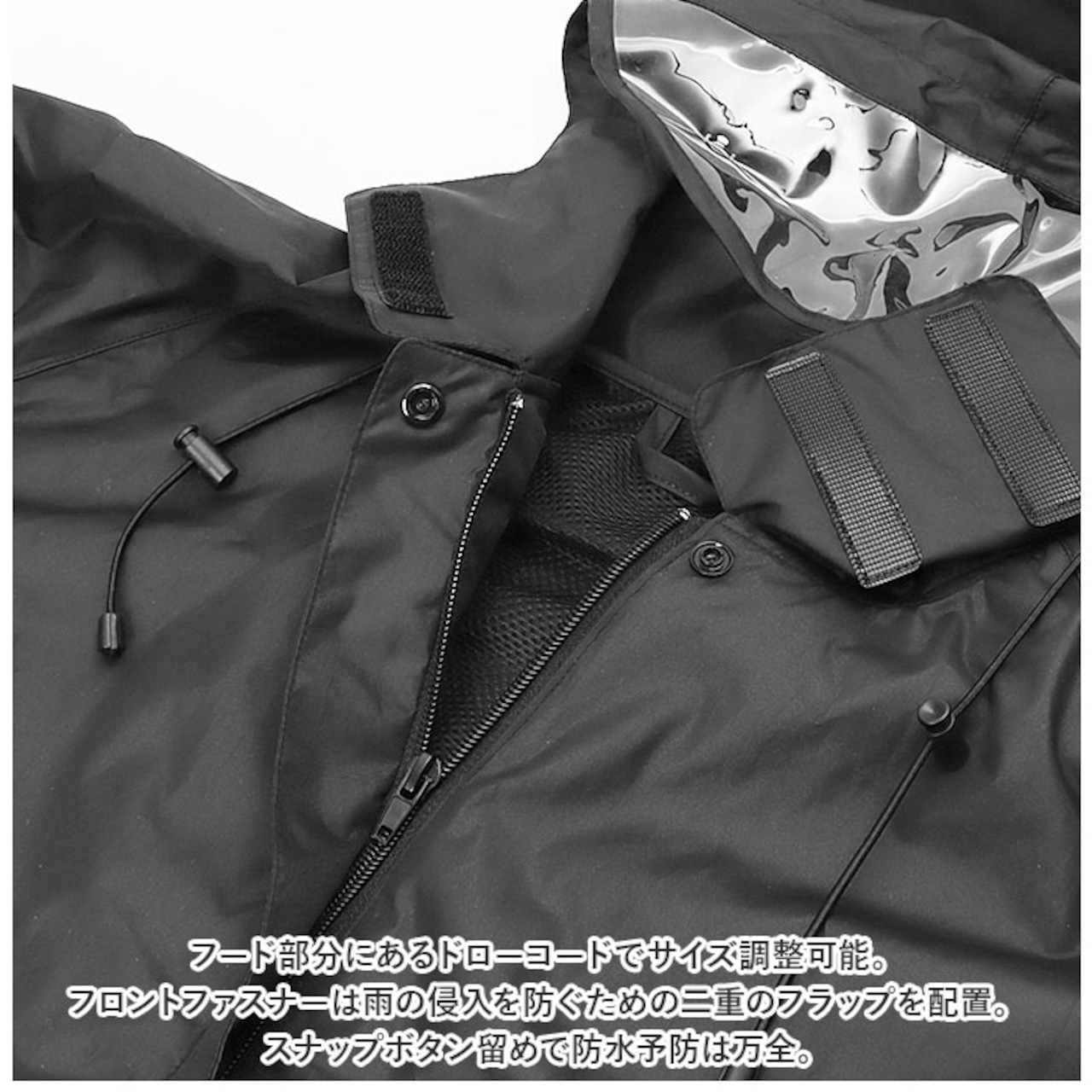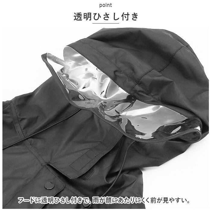 ・フードに透明ひさし付きで、雨が顔にあたりにくく前が見やすい。フード部分にあるドローコードでサイズ調整可能。