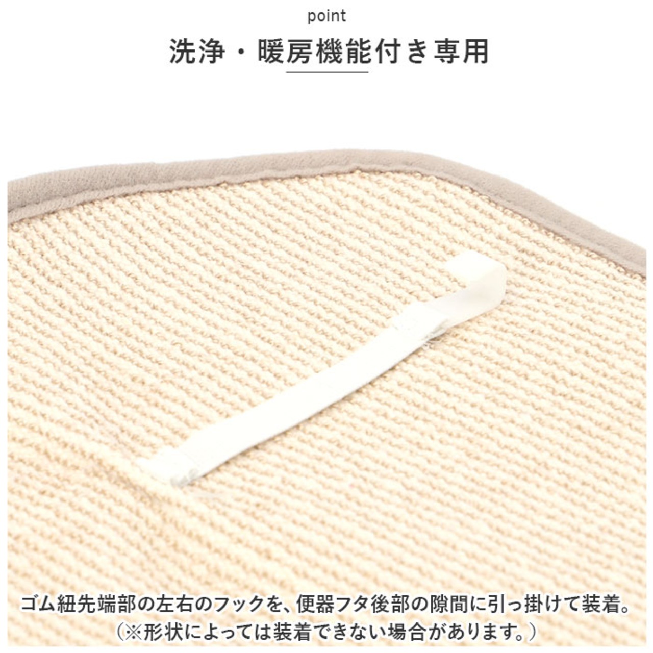 ・ゴム紐先端部の左右のフックを、便器フタ後部の隙間に引っ掛けて装着。(※形状によっては装着できない場合があります。)