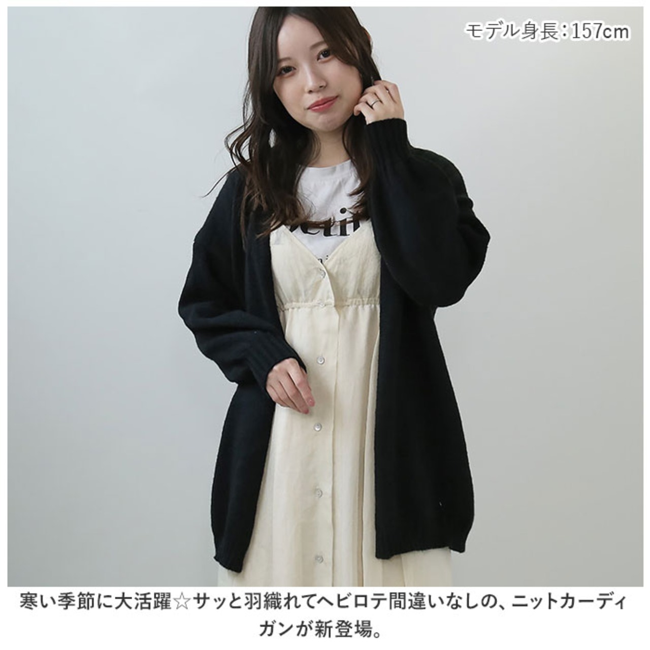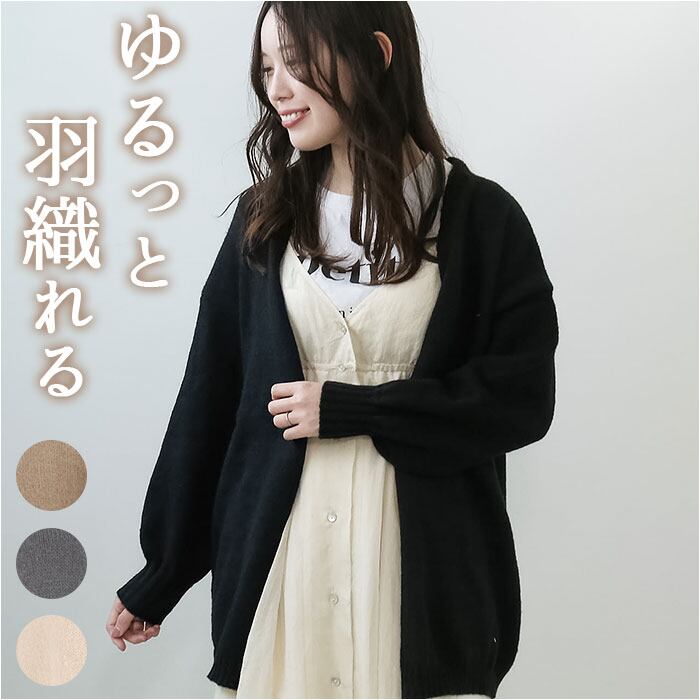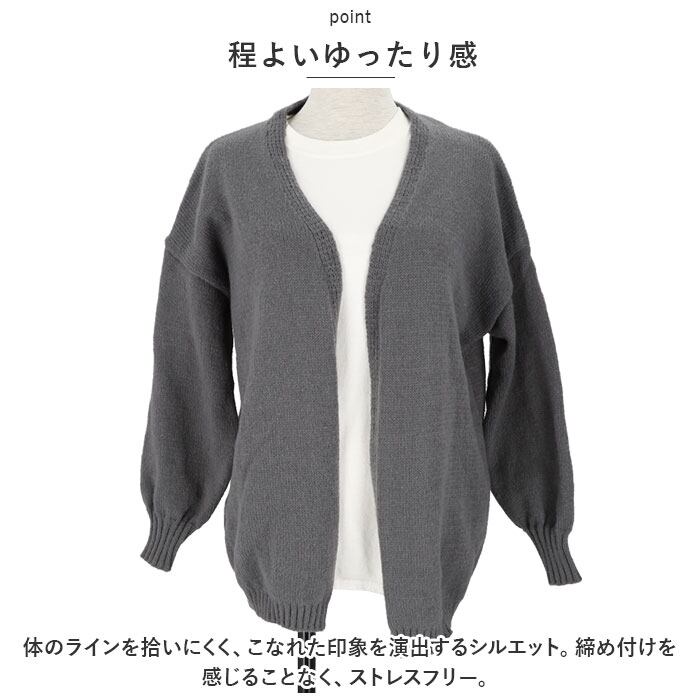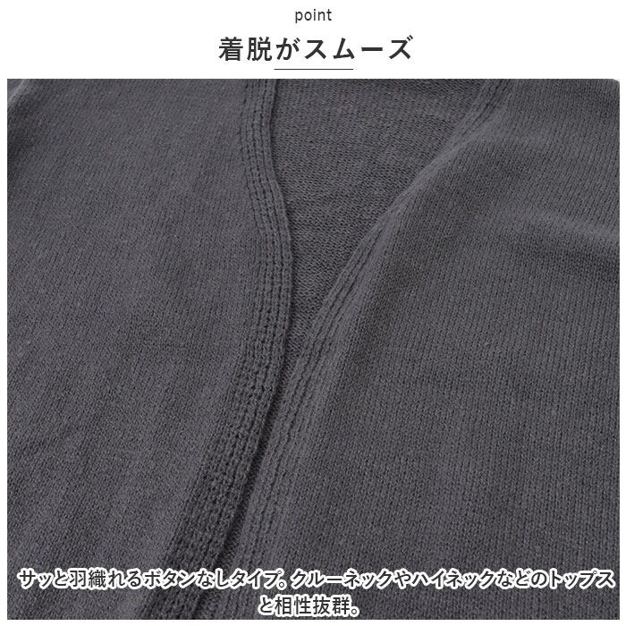 ・サッと羽織れるボタンなしタイプ。クルーネックやハイネックなどのトップスと相性抜群。