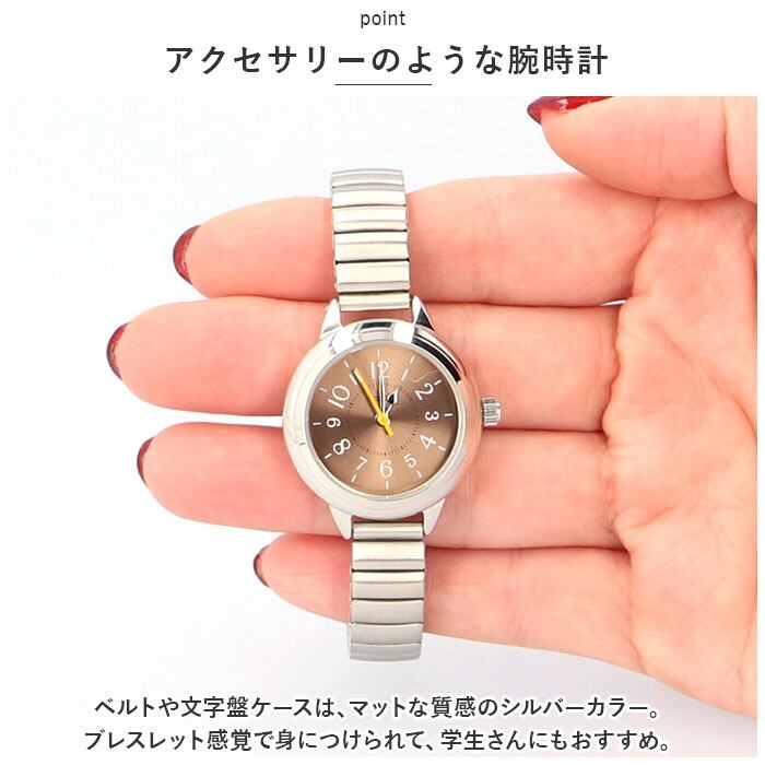 ・ベルトや文字盤ケースは、マットな質感のシルバーカラー。ブレスレット感覚で身につけられて、学生さんにもおすすめ。