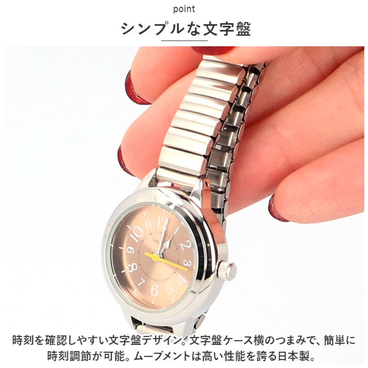 ・時刻を確認しやすい文字盤デザイン。文字盤ケース横のつまみで、簡単に時刻調節が可能。ムーブメントは高い性能を誇る日本製。