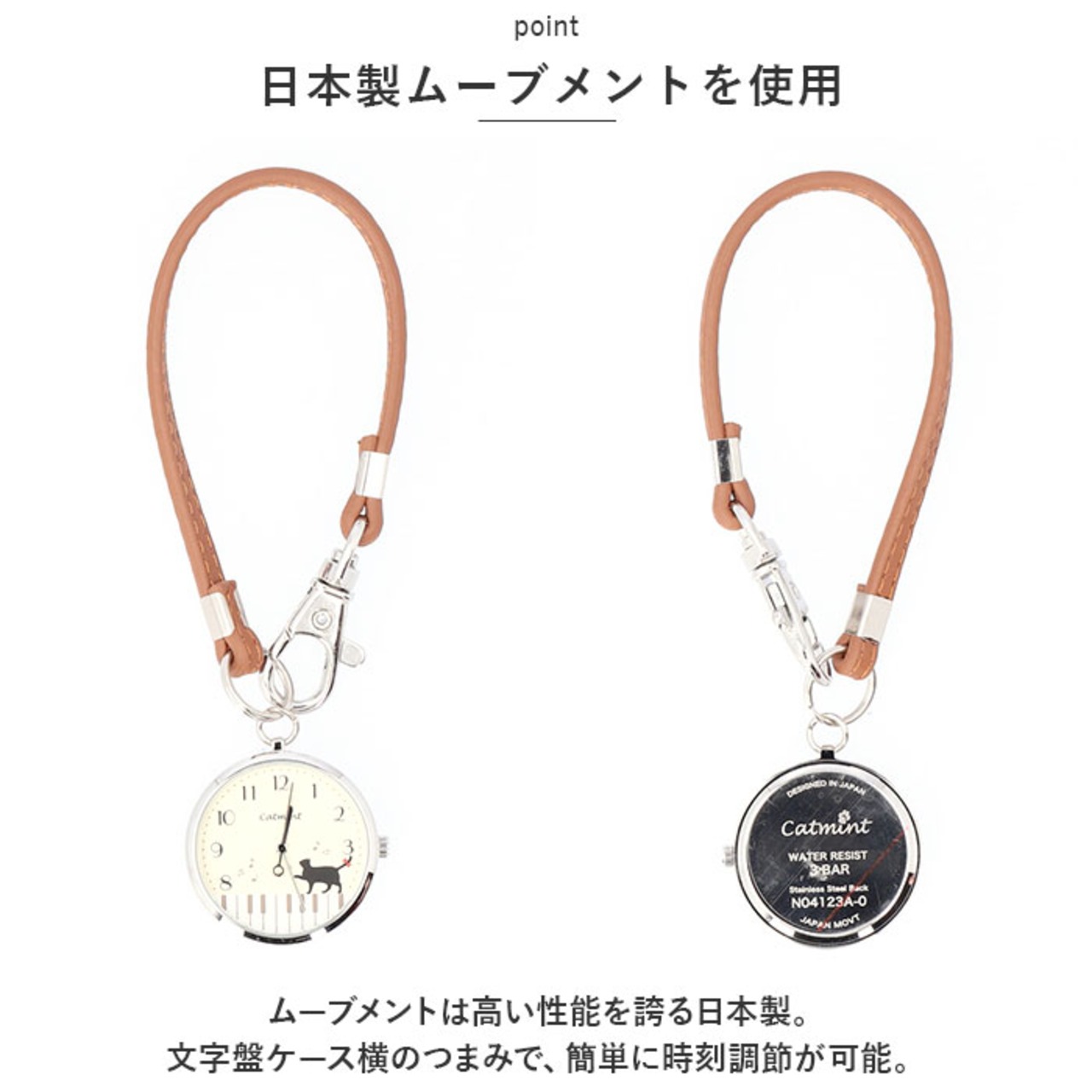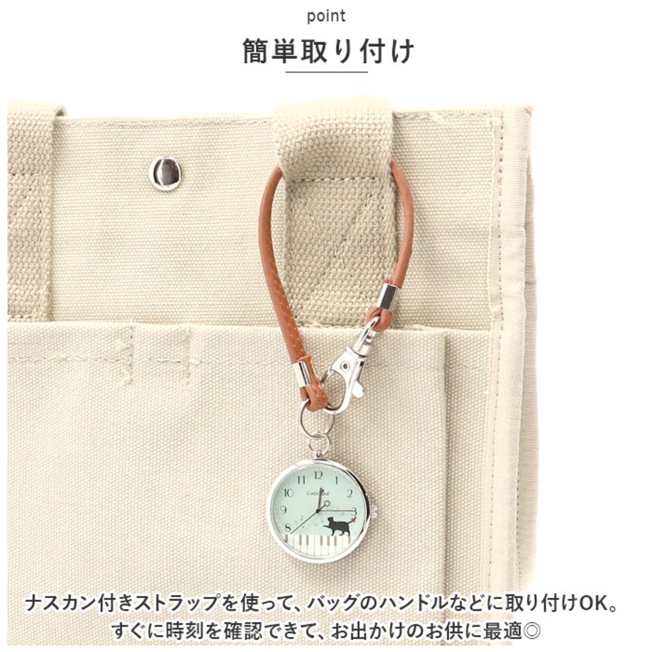 ・ナスカン付きストラップを使って、バッグのハンドルなどに取り付けOK。すぐに時刻を確認できて、お出かけのお供に最適◎