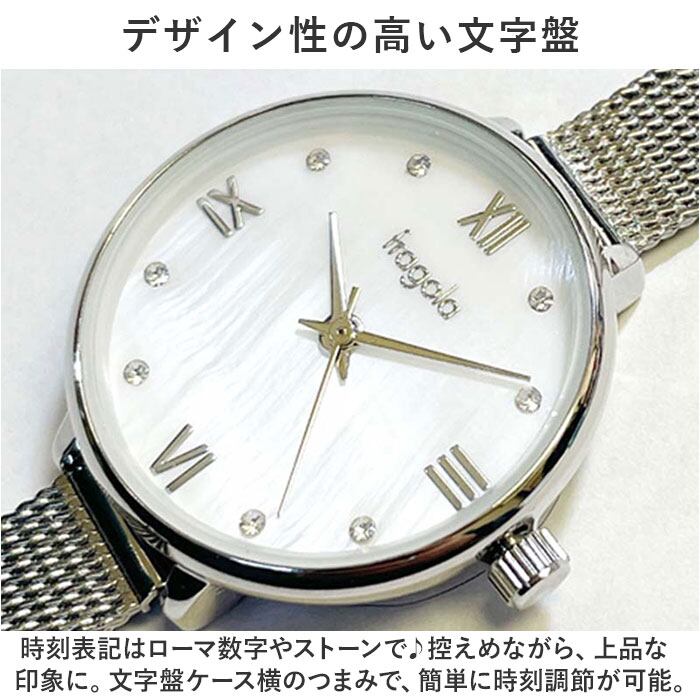 ・時刻表記はローマ数字やストーンで♪控えめながら、上品な印象に。文字盤ケース横のつまみで、簡単に時刻調節が可能。
