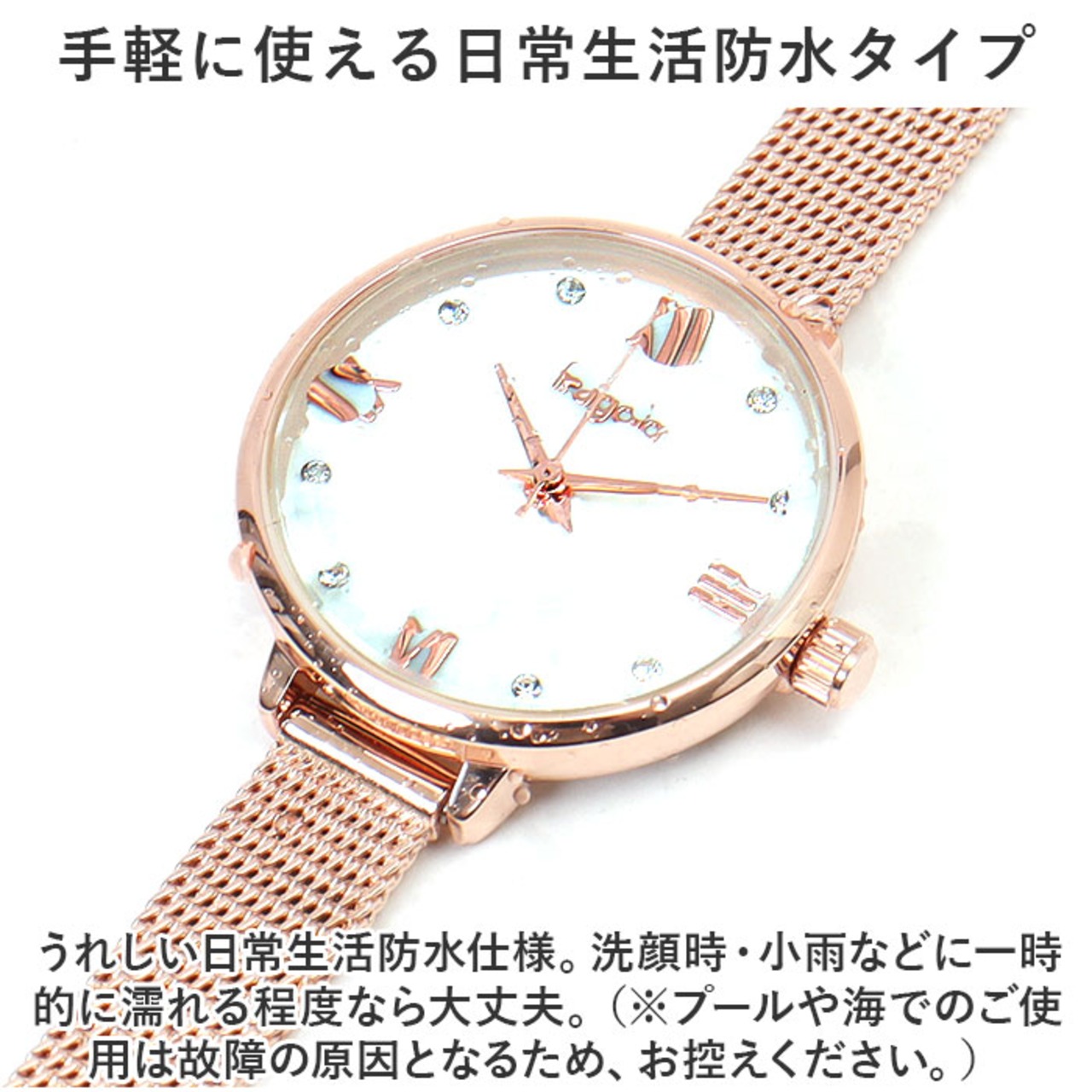 ・うれしい日常生活防水仕様。洗顔時・小雨などに一時的に濡れる程度なら大丈夫。(※プールや海でのご使用は故障の原因となるため、お控えください。)