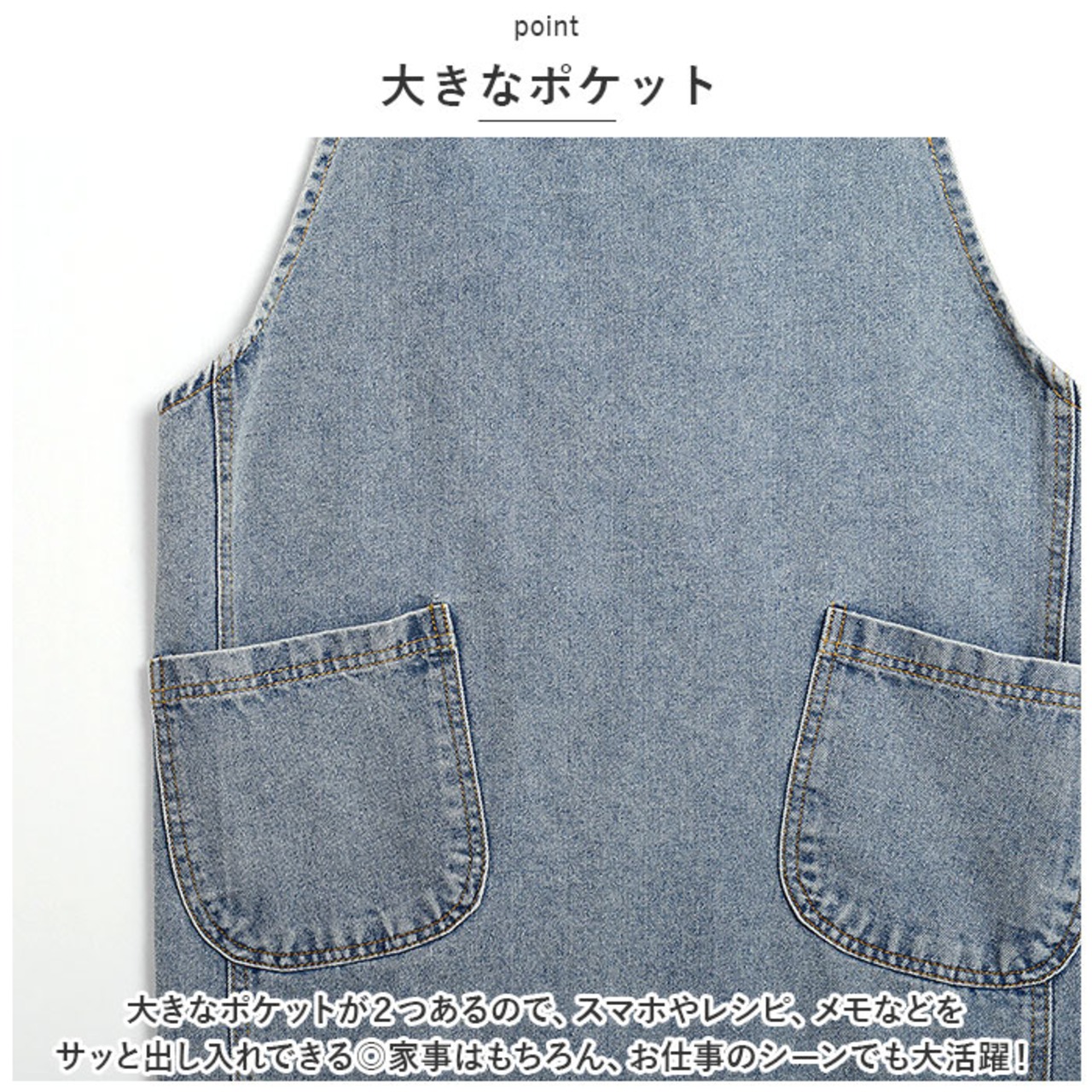 ・大きなポケットが2つあるので、スマホやレシピ、メモなどをサッと出し入れできる◎家事はもちろん、お仕事のシーンでも大活躍!