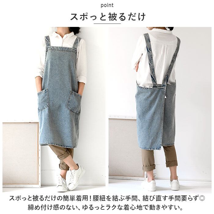 ・スポっと被るだけの簡単着用!腰紐を結ぶ手間、結び直す手間要らず◎締め付け感のない、ゆるっとラクな着心地で動きやすい。