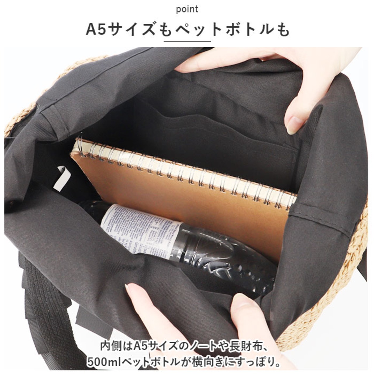 ・内側はA5サイズのノートや長財布、500mlペットボトルが横向きにすっぽり。