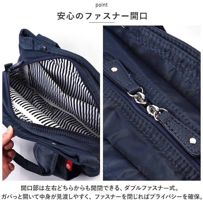 ・開口部は左右どちらからも開閉できる、ダブルファスナー式。ガバっと開いて中身が見渡しやすく、ファスナーを閉じればプライバシーを確保。