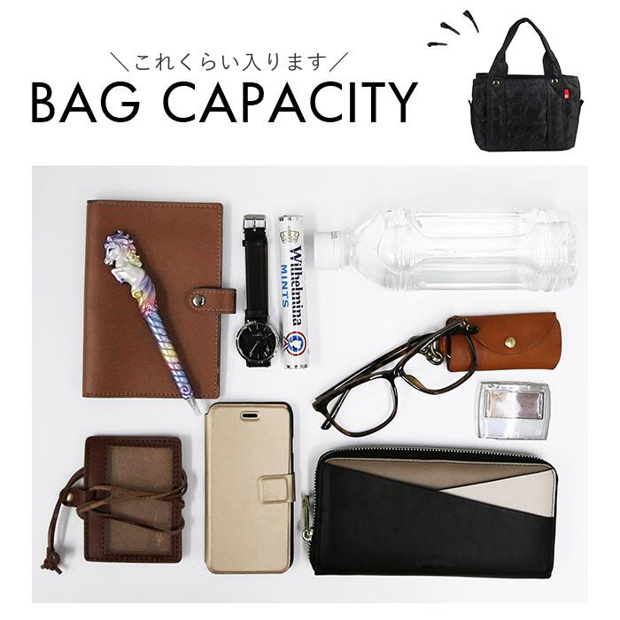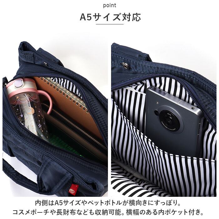 ・内側はA5サイズやペットボトルが横向きにすっぽり。コスメポーチや長財布なども収納可能。横幅のある内ポケット付き。