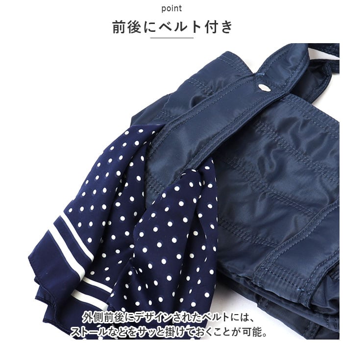 ・外側前後にデザインされたベルトには、ストールなどをサッと掛けておくことが可能。