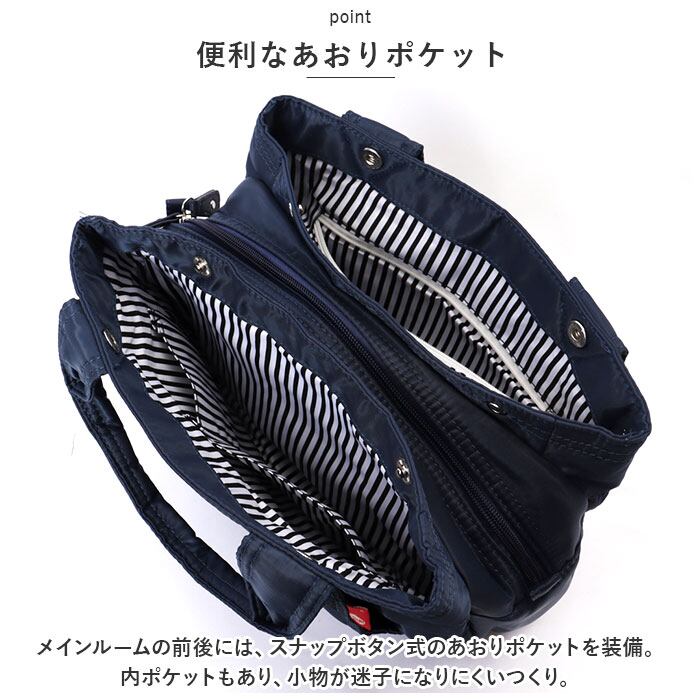 ・メインルームの前後には、スナップボタン式のあおりポケットを装備。内ポケットもあり、小物が迷子になりにくいつくり。