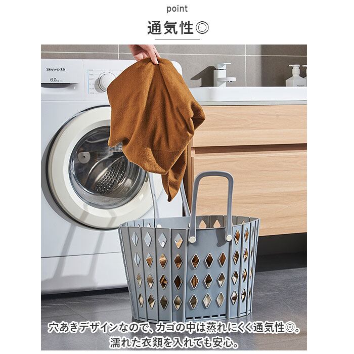 ・穴あきデザインなので、カゴの中は蒸れにくく通気性◎。濡れた衣類を入れても安心。