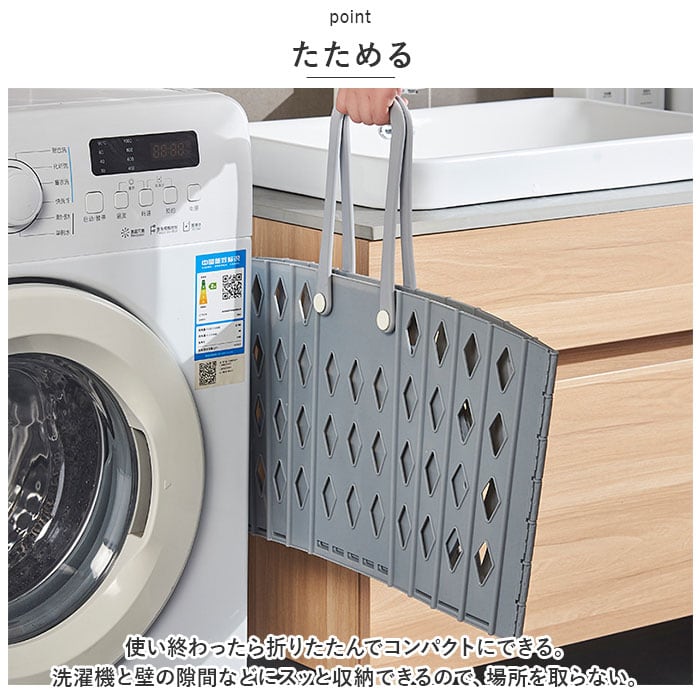 ・取っ手を使って壁掛け収納もできる。洗濯機に掛けて、脱いだ服をポイポイ入れるも良し。ランドリーで大活躍!