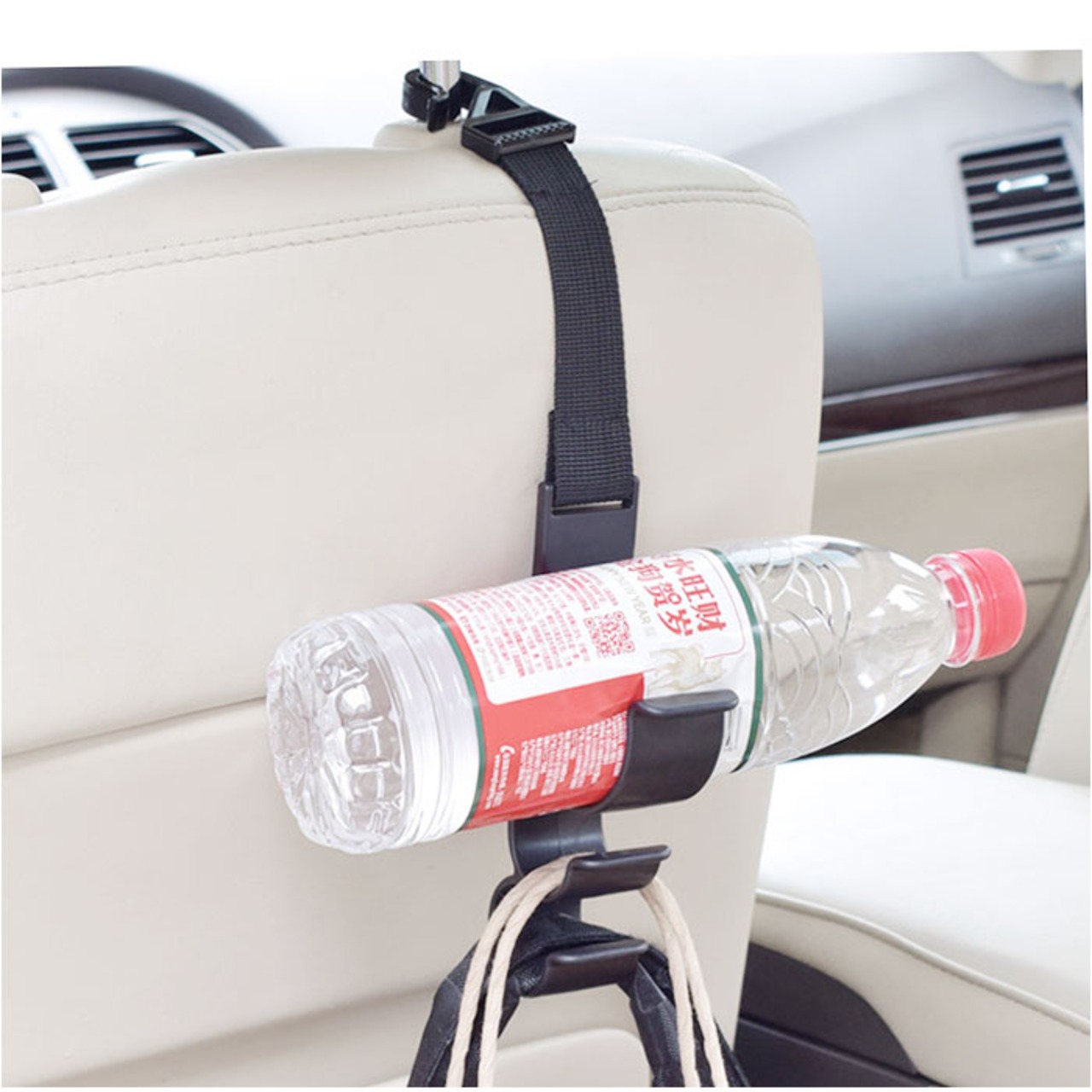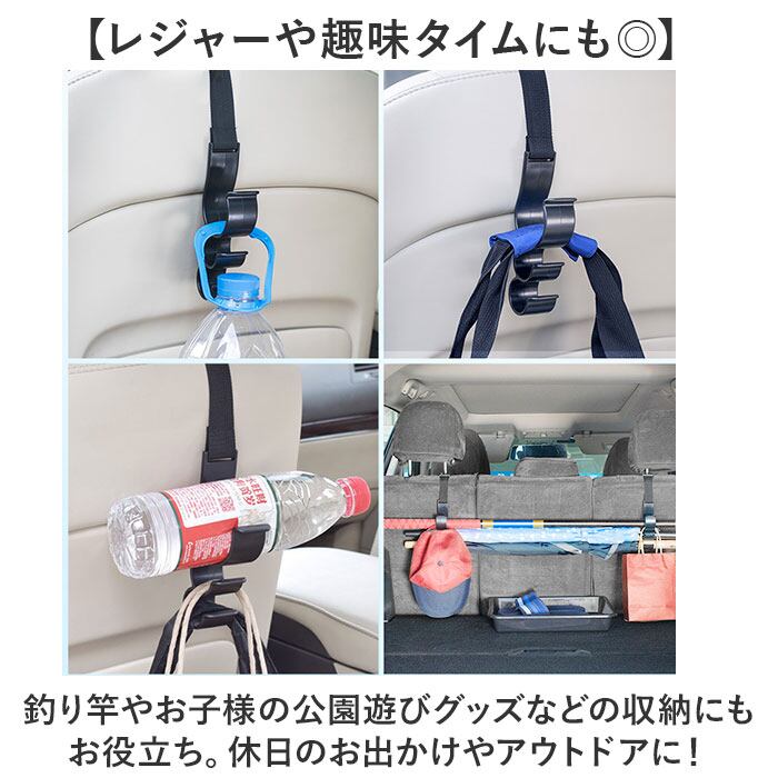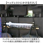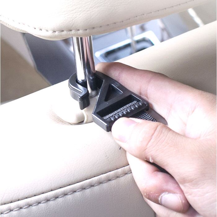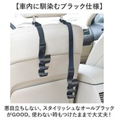 ・フックをヘッドレストにつけるだけで設置完了。ベルトの長さと使用幅をお好みで調節できる!