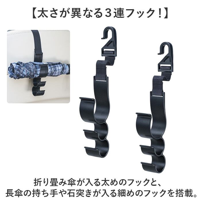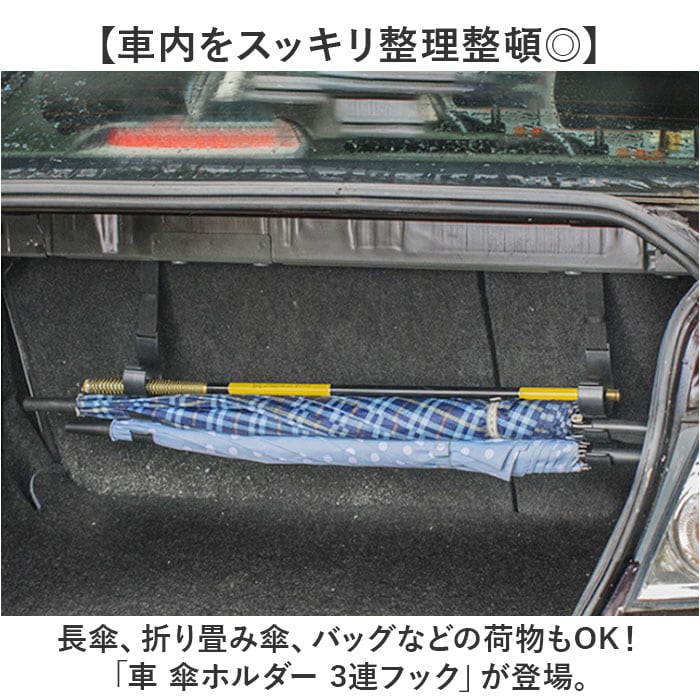 ・長傘、折り畳み傘、バッグなどの荷物もOK!「車 傘ホルダー 3連フック」が登場。