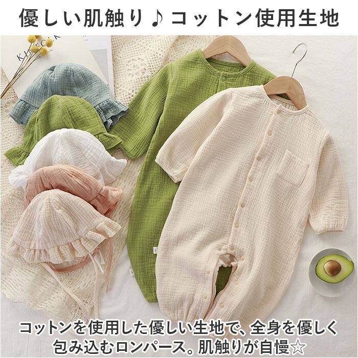 ・コットンを使用した優しい生地で、全身を優しく包み込むロンパース。肌触りが自慢☆