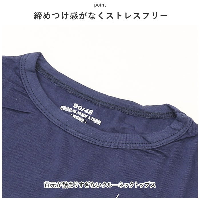 ・首元が詰まりすぎないクルーネックトップス&ウエストゴム仕様のパンツ。パジャマやルームウェアとして大活躍!