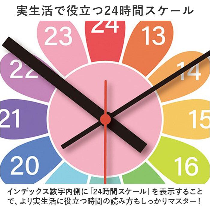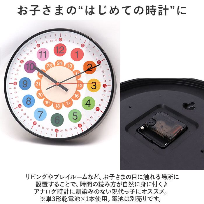 ・ラウンド型の大きめの文字盤に、カラフルなインデックス数字をくっきり見やすく並べた、時間の感覚を直観的に学習できる知育時計。