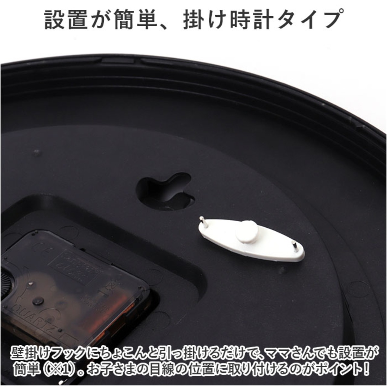 ・壁掛けフックにちょこんと引っ掛けるだけで、ママさんでも設置が簡単(※1)。お子さまの目線の位置に取り付けるのがポイント!
