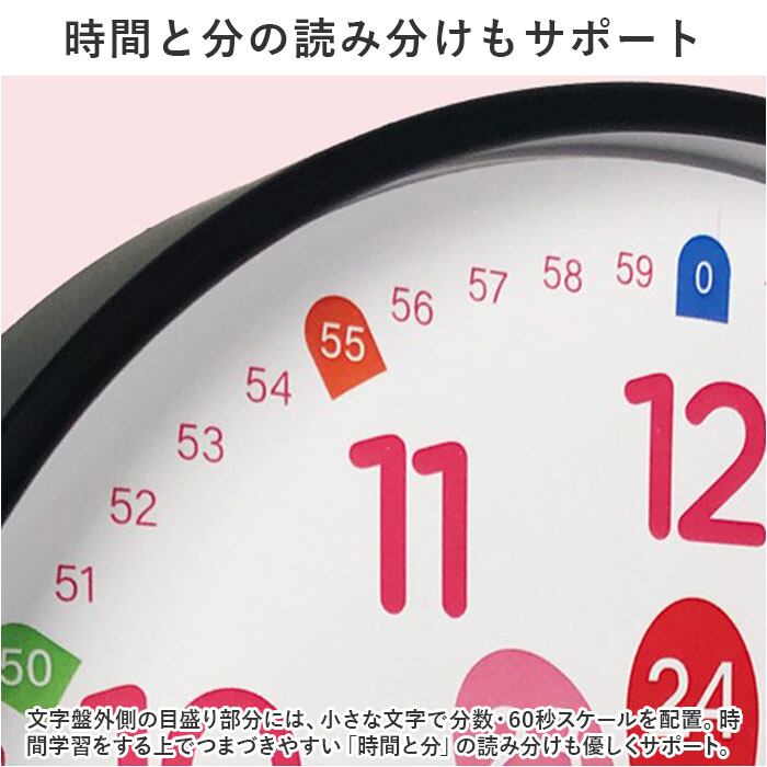 ・文字盤外側の目盛り部分には、小さな文字で分数・60秒スケールを配置。時間学習をする上でつまづきやすい「時間と分」の読み分けも優しくサポート。