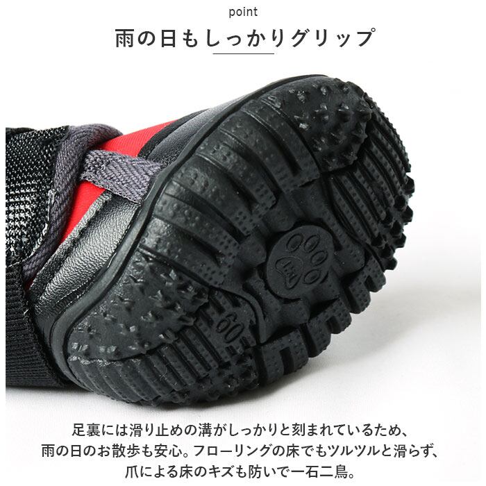・足裏には滑り止めの溝がしっかりと刻まれているため、雨の日のお散歩も安心。フローリングの床でもツルツルと滑らず、爪による床のキズも防いで一石二鳥。