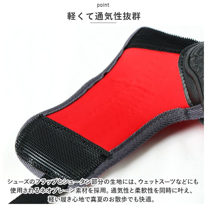 ・シューズのフラップとシュータン部分の生地には、ウェットスーツなどにも使用されるネオプレーン素材を採用。通気性と柔軟性を同時に叶え、軽い履き心地で真夏のお散歩でも快適。