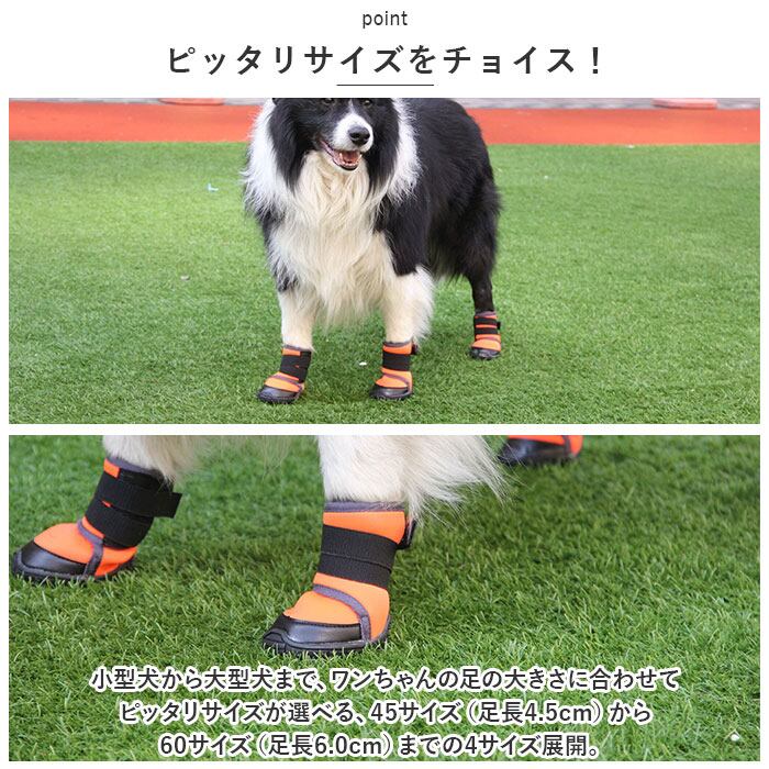 ・小型犬から大型犬まで、ワンちゃんの足の大きさに合わせてピッタリサイズが選べる、45サイズ(足長4.5cm)から60サイズ(足長6.0cm)までの4サイズ展開。