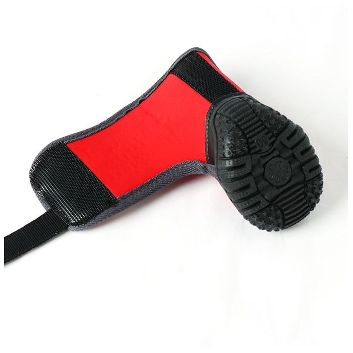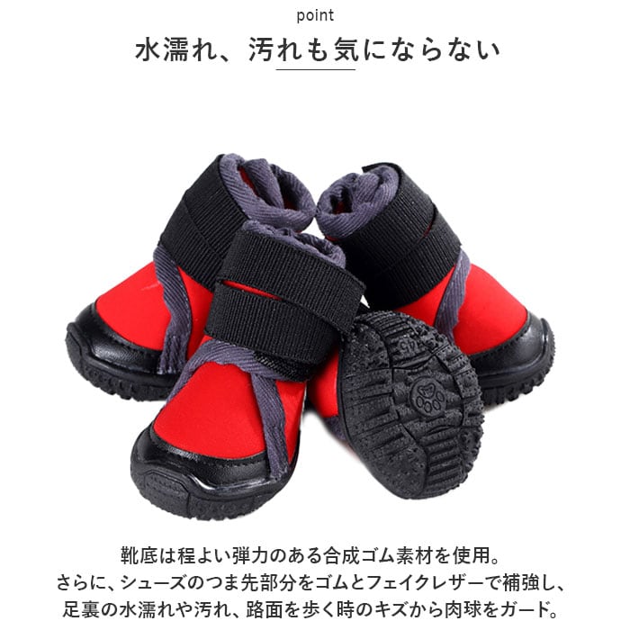 ・靴底は程よい弾力のある合成ゴム素材を使用。さらに、シューズのつま先部分をゴムとフェイクレザーで補強し、足裏の水濡れや汚れ、路面を歩く時のキズから肉球をガード。