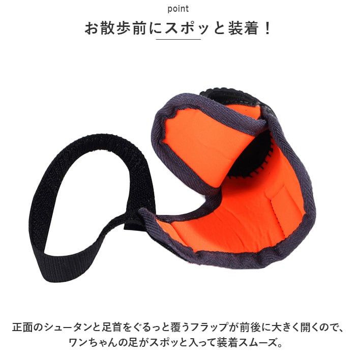・正面のシュータンと足首をぐるっと覆うフラップが前後に大きく開くので、ワンちゃんの足がスポッと入って装着スムーズ。