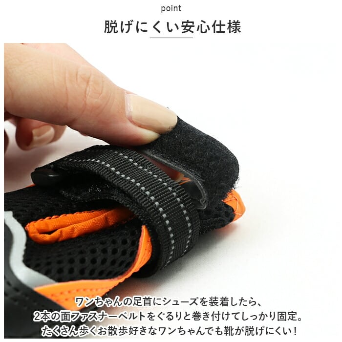 ・ワンちゃんの足首にシューズを装着したら、2本の面ファスナーベルトをぐるりと巻き付けてしっかり固定。たくさん歩くお散歩好きなワンちゃんでも靴が脱げにくい!