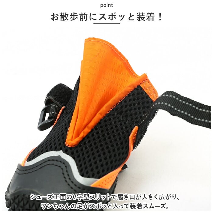 ・シューズ正面のV字型スリットで履き口が大きく広がり、ワンちゃんの足がスポッと入って装着スムーズ。