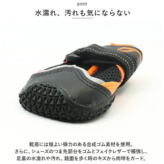 ・靴底には程よい弾力のある合成ゴム素材を使用。さらに、シューズのつま先部分をゴムとフェイクレザーで補強し、足裏の水濡れや汚れ、路面を歩く時のキズから肉球をガード。