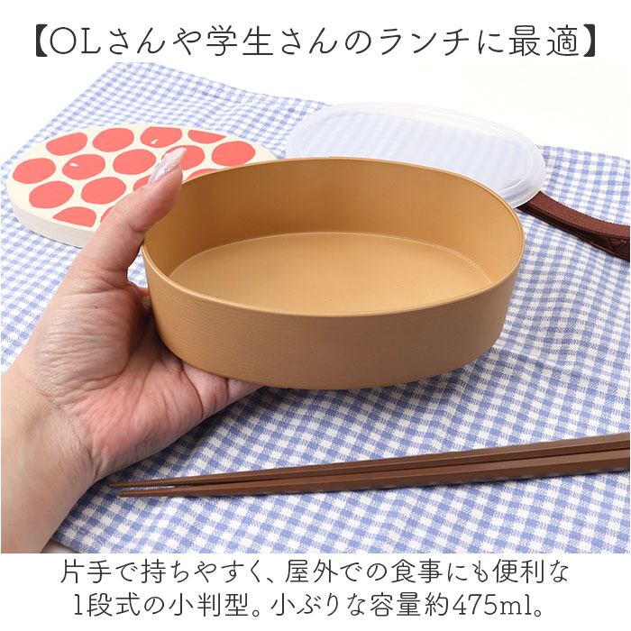 ・片手で持ちやすく、屋外での食事にも便利な1段式の小判型。小ぶりな容量約475ml。