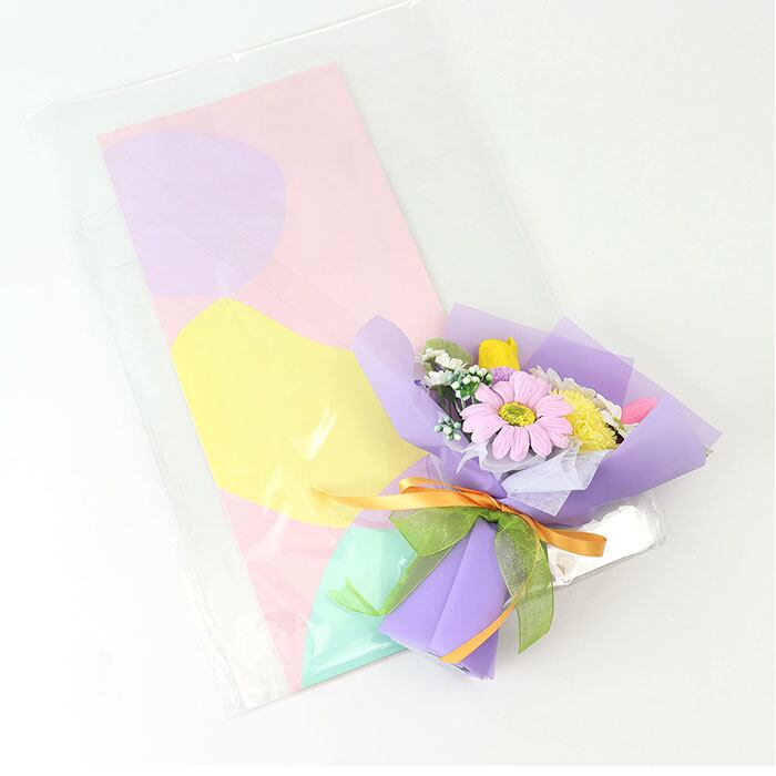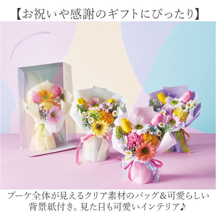・ブーケ全体が見えるクリア素材のバッグ&可愛らしい背景紙付き。見た目も可愛いインテリア♪
