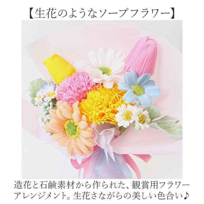 ・造花と石鹸素材から作られた、観賞用フラワーアレンジメント。生花さながらの美しい色合い♪