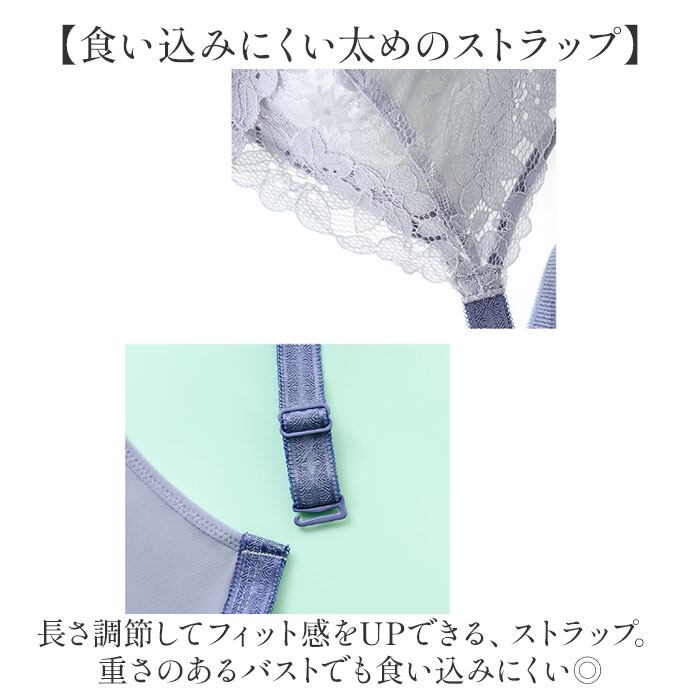 ・長さ調節してフィット感をUPできる、ストラップ。重さのあるバストでも食い込みにくい◎